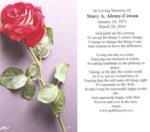 Sussex, NJ- Stacy Ann Alemy-Cowan passed suddenly on March 28, 2016 at her residence. She was 45. Stacy was born in Dover, NJ to Robert and Patricia Ann (Onder) Alemy. She attended schools in Sparta, ...