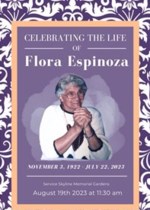 Flora Maria Espinoza, age 100, of Portland, Oregon passed away on Saturday, July 22, 2023. A visitation for Flora will be held Saturday, August 19, 2023, with guests welcome to gather at 11:00am. Th...