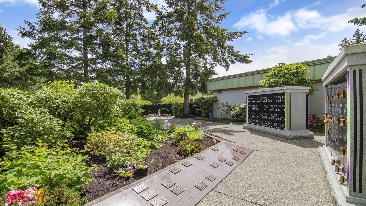 Columbariums at First Memorial Garden of MemoriesUnique to Vancouver Island, the Garden of Memories is a place to memorialize loved ones who have chosen cremation. Nestled in a hollow adjacent to Victoria's Royal Oak Burial Park, it offers a tranquil setting for families and friends to gather and reflect. Thoughtfully situated between elegant gazebos and winding paths are a range of inurnment choices: granite columbaria, memorial books, ossuaries, urn gardens, gazebo niches, scroll walls, terraced brick wall niches and family estate memorials beautifully finished in natural stone. A waterfall provides a gentle soundtrack; delicate patterns of rain and sunlight dance across the pond.