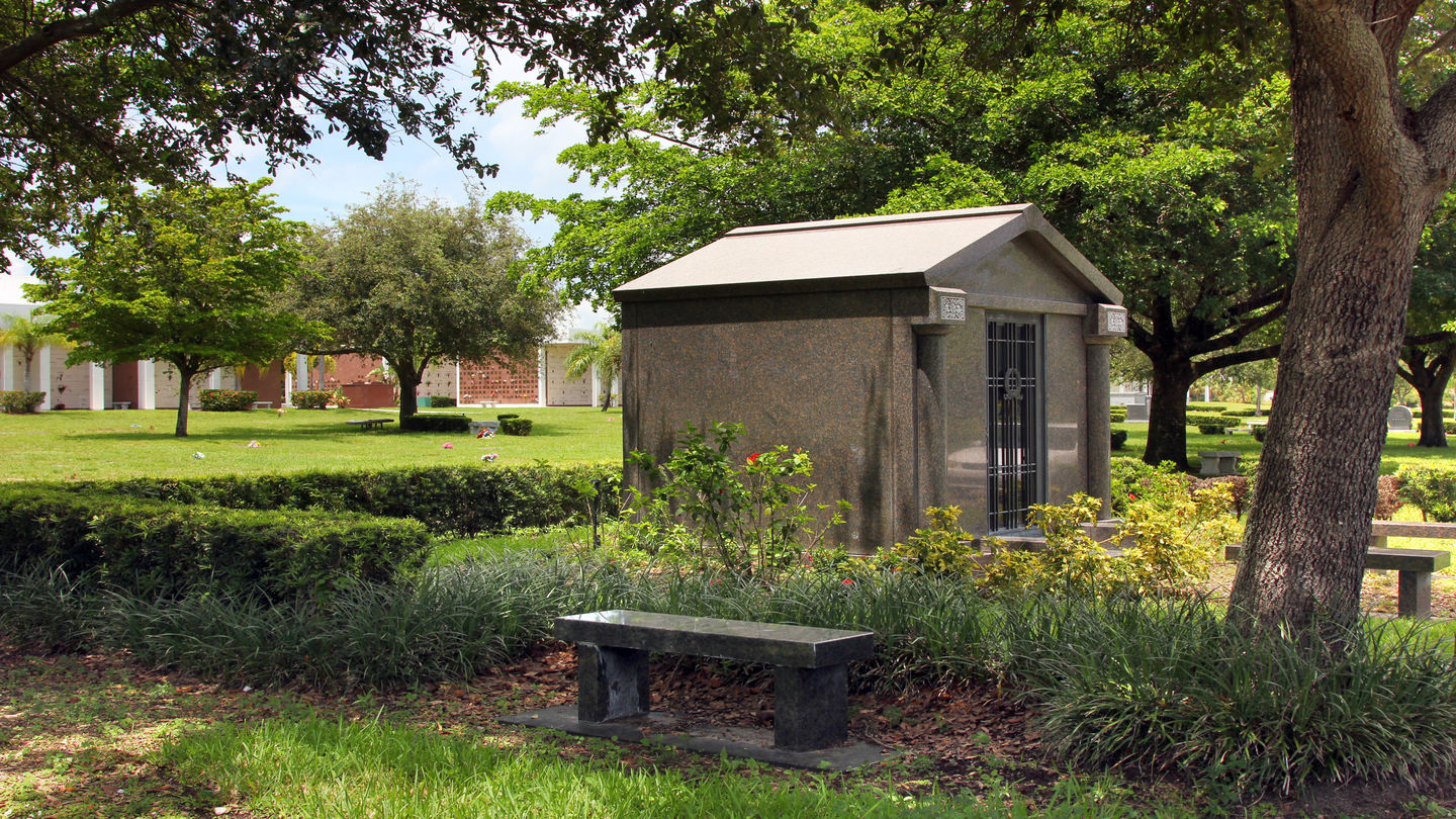 Cemetery grounds with a columbarium at Royal Palm Funeral Home.The peaceful Royal Palm Memorial Gardens offers a range of burial options, including in-ground burial with bronze memorials and upright monument sections and entombment in our community mausoleums. For those who prefer something more exclusive, we also offer private family estates as well as private individual and family mausoleums that can be custom-built to your specifications. For families who choose cremation, we have many cremation memorial choices, including niches, columbaria and memorial benches.