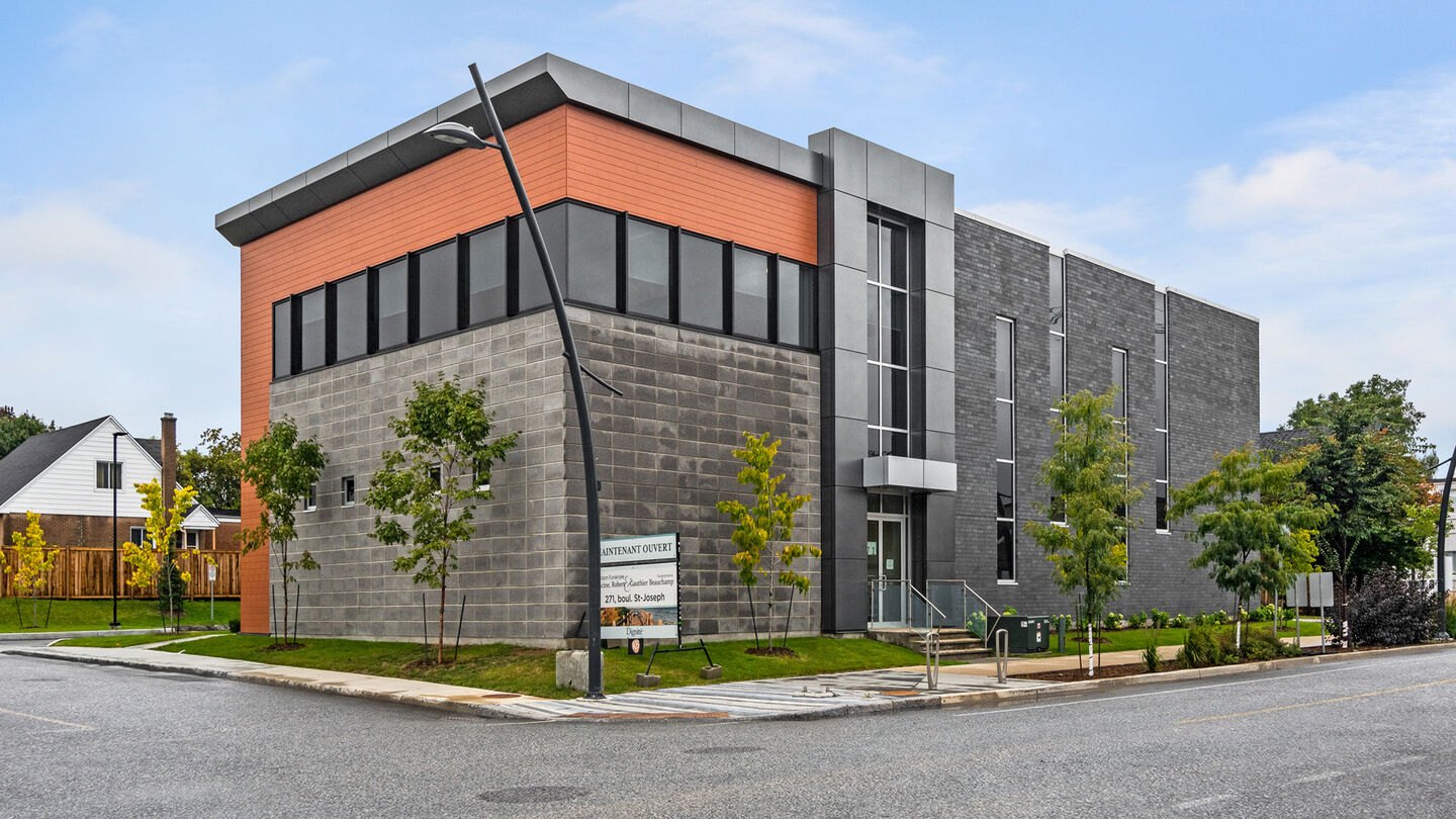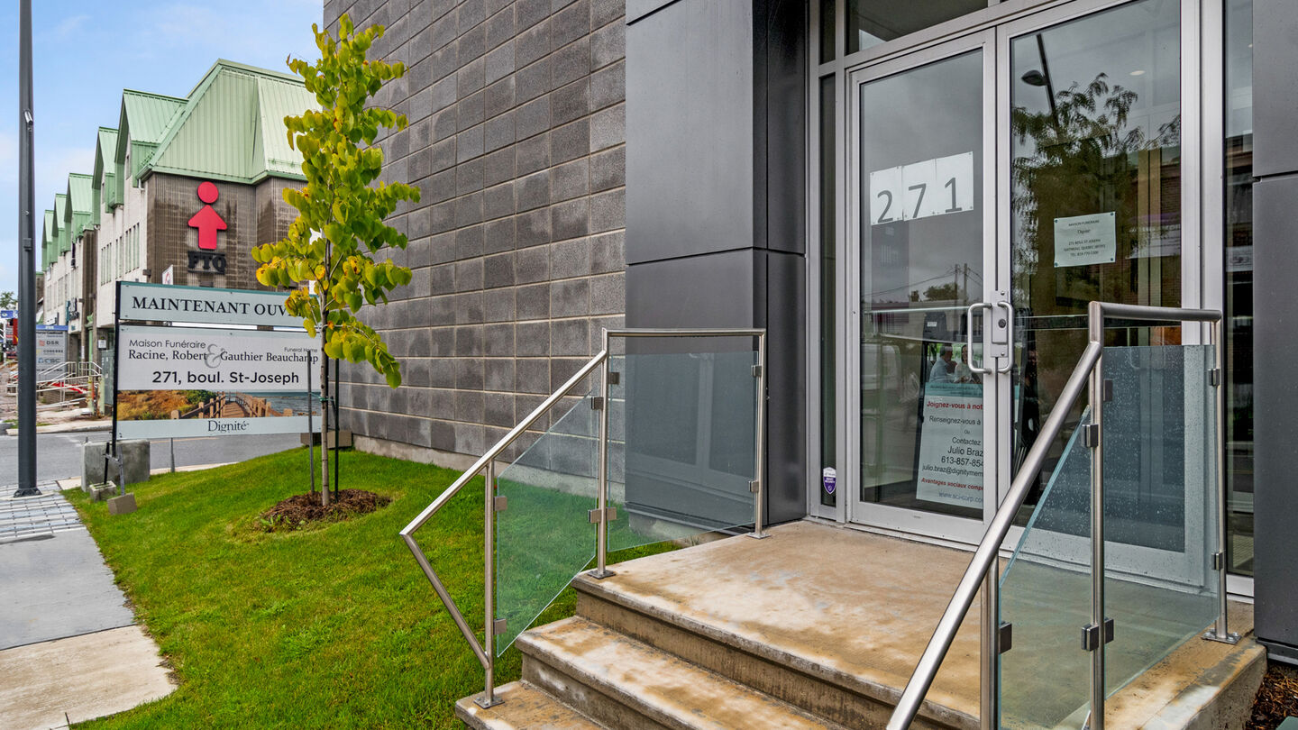 Maison funéraire Racine, Robert & Gauthier Beauchamp Funeral HomeLocated on Boulevard Saint-Joseph, our brand-new funeral home sits on the same land where our previous building sat. The new facility is a comfortable place in which to honour your loved one. With modern amenities and flexible spaces, the funeral home features neutral colors, stonework detailing, modern furniture and an abundance of natural light.