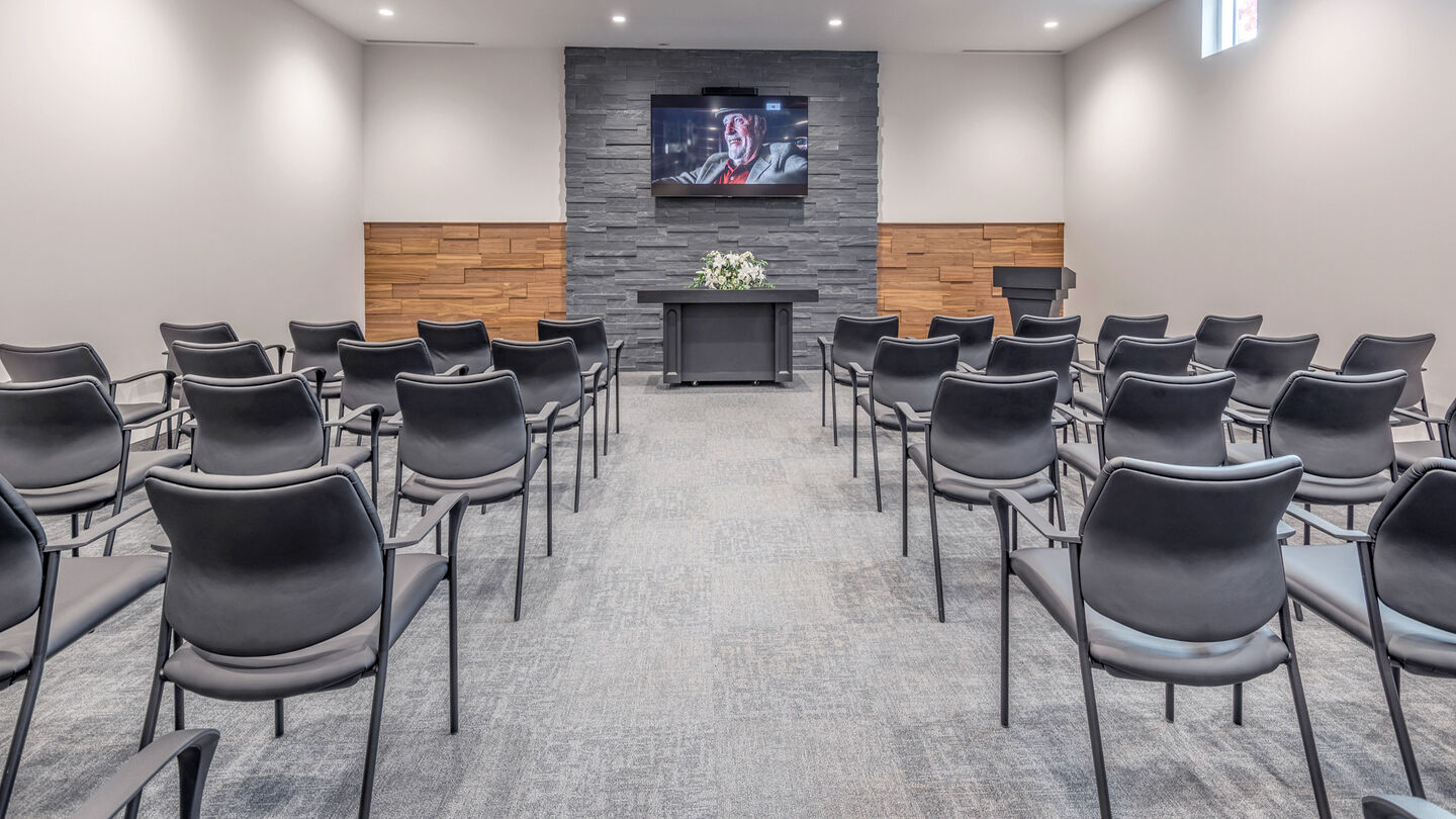 The visitation parlour offers a lounge-like setting, with black leather couches and chairs. A moving wall can be opened or closed depending on the number of guests expected. The parlour can also be used for overflow from the chapel and includes televisions for livestreaming.
