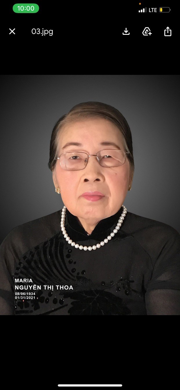 A visitation for Thoa will be held Thursday, February 18, 2021 from 1:00 PM to 8:00 PM at Moore Funeral Home, 1219 North Davis Drive, Arlington, TX 76012. A visitation will occur Friday, February 19, 2021 from 1:00 PM to 8:00 PM, 1219 North Davis Drive, Arlington, TX 76012. A funeral service will occur Saturday, February 20, 2021 from 8:30 AM to 9:30 AM at Vietnamese Martyrs Catholic Church, 801 E. Mayfield, Arlington, TX 76014. A committal service will occur Saturday, February 20, 2021 at Moore Memorial Gardens, 1219 North Davis Drive, Arlington, TX 76012.