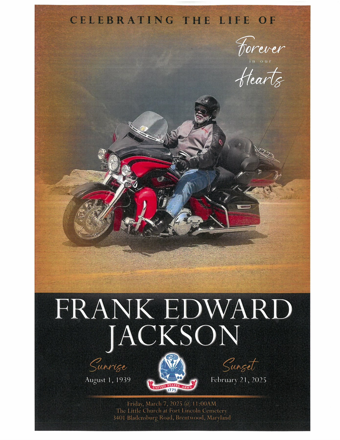In his free time, Frank enjoyed singing and riding his motorcycle. During the 1970s, he sang gospel/spiritual music with The Brothers of Washington, D.C. In the ‘80’s and ‘90’s he performed at The Kennedy Center, with The Paul Hill Chorale. After retirement, he was an active member of the American Legion; and served as President of the Montgomery County Harley Owners Group (HOG) for a time. He was also a member of Montgomery County chapter of Vietnam Veterans of America.