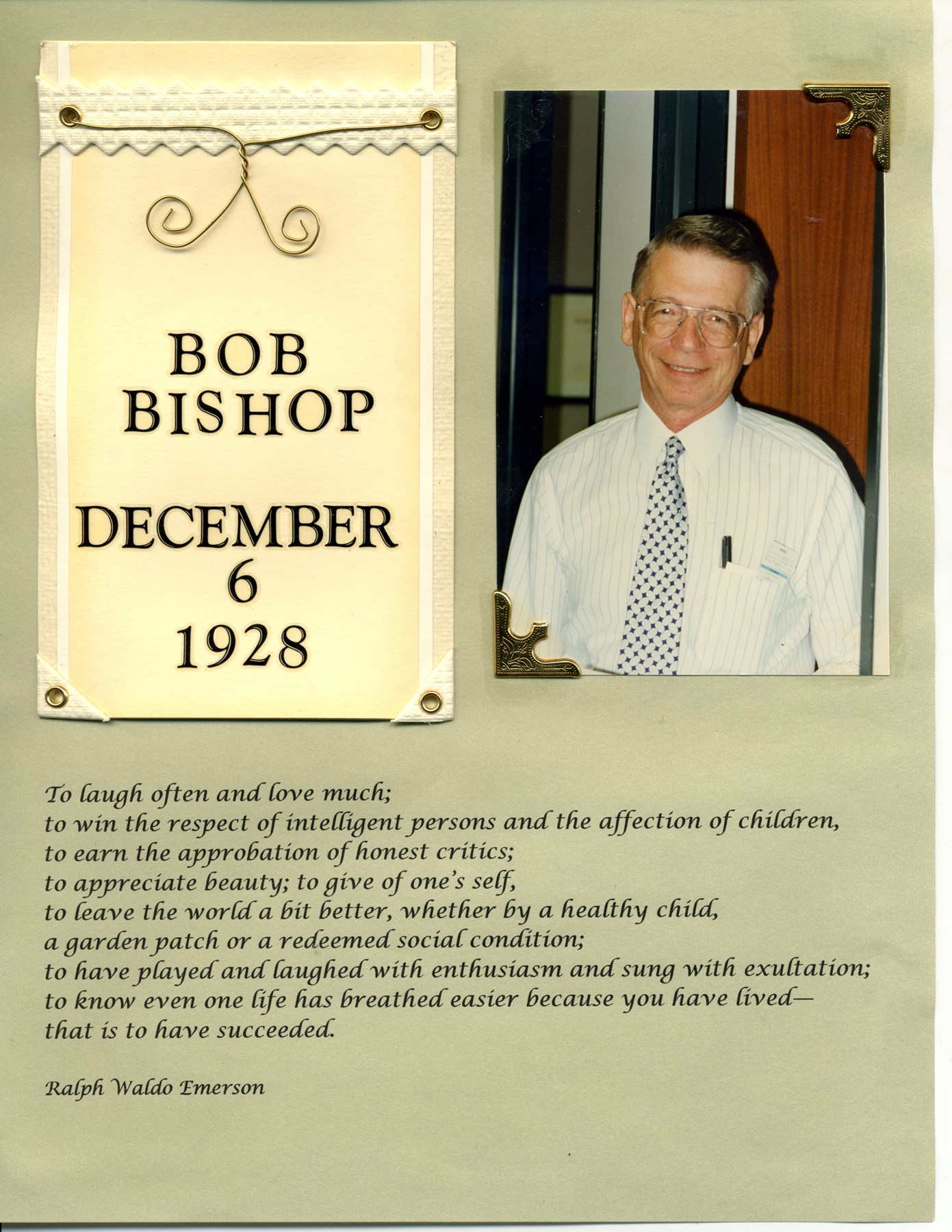 Dr. Bishop was born in Connecticut to Earle and Sarah Bishop. He was the youngest of three children and enjoyed a close, lifelong relationship with his two sisters, Jane Poole and Barbara Boley. He attended Trinity College in Hartford and received his medical degree from Columbia College of Physicians and Surgeons in New York City. He moved to Texas in 1957, serving in the military for two years in San Antonio, then moving to Dallas where he was the medical director for New York Life Insurance. He opened his private medical practice in Dallas in 1960, and he enjoyed the opportunity to serve his patients and community for many years. After leaving private practice, he continued to provide medical and risk assessment advice to numerous insurance companies.