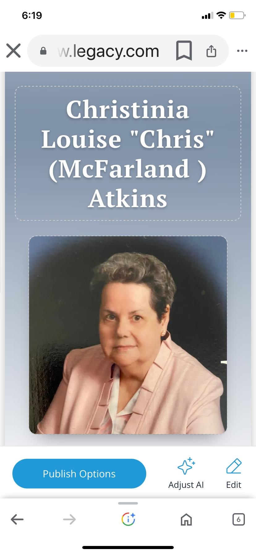 Chris is survived by her children, Frank King, Sheila Barker, and Curtis (Patty) King; her sister, Cheryl Jackson; her grandchildren, Stacie (Johnny) Williams, Amanda Riddell, Chanda Richards, Jennifer Thery, Rob King, and Ron (Amanda) King; along with 17 great-grandchildren and 4 great-great-grandchildren. She was preceded in death by her parents, Cordie Powell and Frank McFarland; her husband, Edward King; her son, Edward King Jr.; her siblings, Clara Bryant, Linville McFarland, Elsie VanCleve, Bobbie Caron, and Ruth Howard; her granddaughter, Deanna Scott and her great-grandson, Ethan King.