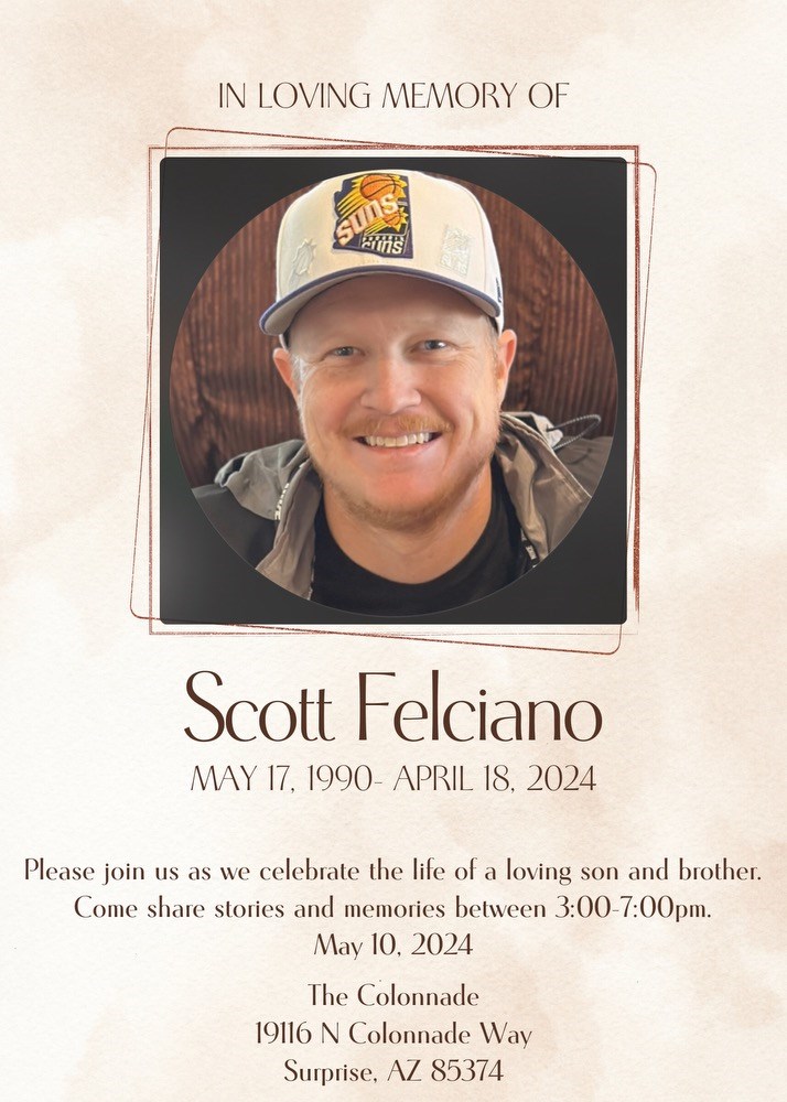 Scott Paul Felciano of Surprise, Arizona passed away April 18, 2024 at the age of 33. He was born May 17, 1990 in Glendale, Arizona to Randy Felciano and Peggy (Boge) Felciano, both of whom survive him. He is also survived by his sisters Nicole (Felciano) Thomas and Jennifer Felciano; brother in law Mark Thomas; grandparents Bill and Sharon Boge and Frank and Jeaneen Felciano; niece Grace Thomas, and nephew Jacob Thomas, as well as numerous beloved family and friends.