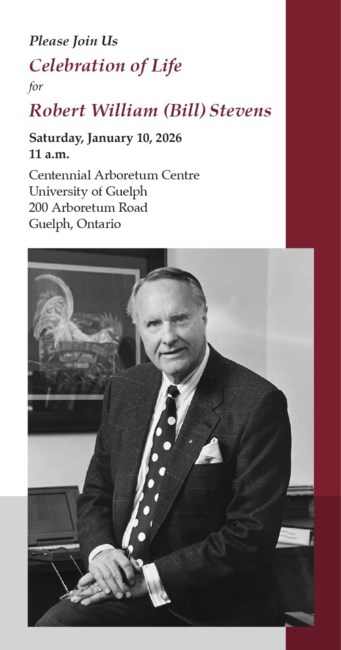 Please the family for a Celebration of Life for Robert William (Bill) Stevens, Saturday, January 10, 2026 11 a.m.Centennial Arboretum Centre, University of Guelph, 200 Arboretum Road, Guelph, Ontario