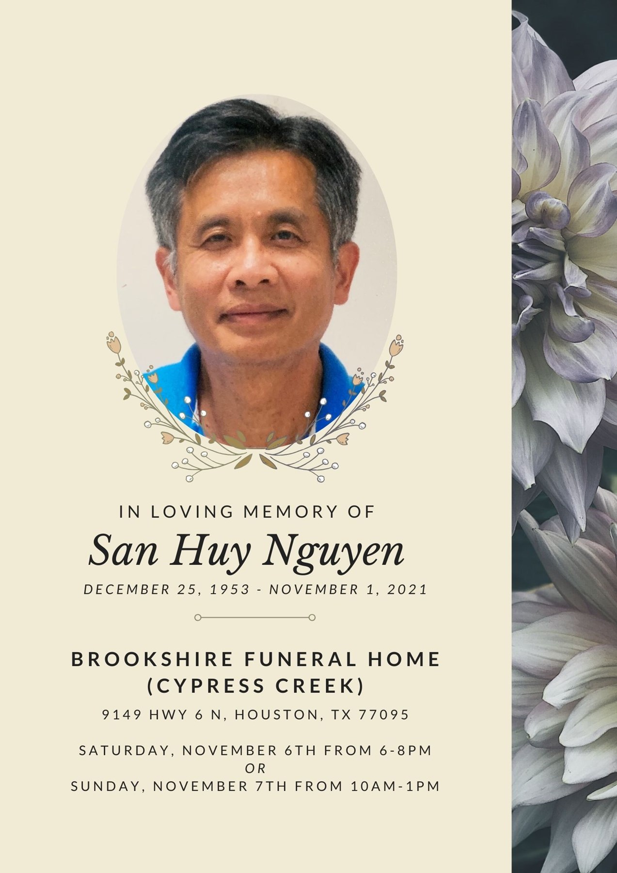 Everyone who knew San knew that he was an extremely hardworking, determined, and loving person- he loved his family very much and was a “family man” in every sense of the term. He is survived by his wife, Huyen of Houston, TX; daughter Diana of Spring, TX; daughter Julie of Austin, TX; and granddaughter Riley. San also leaves behind four sisters and his nieces and nephews. He will forever be in their hearts and missed very much.