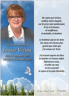 Le 27 décembre 2025 à l'âge 66 ans est décédée Mme Louise Vézina épouse de M. Richard Daigneault. Outre son époux, elle laisse dans le deuil ses soeurs Suzanne (Gilles), Annie (Denis), ses frères Mic...