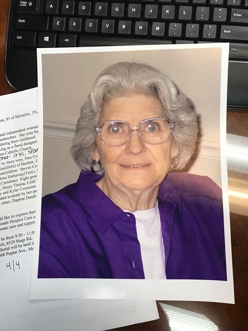 Elizabeth is survived by three sons, Don Crossnine(Melandia) of Bartlett, TN, Michael Crossnine(Debi) of Bartlett, TN and Patrick Crossnine(Lisa) of Eads, TN; Five grandchildren: Steven Crossnine(Amy), Kimberly Thoma(Michael), Dena Hathaway(Troy), Paul Crossnine(Brittany) and Richard Crossnine(Christina); Eight great grandchildren: Ethan and Lindsey Crossnine, Henry Thoma, Lindi Hathaway, Taylor and Zachary Crossnine, Blakely and Kyler Crossnine and a host of nieces and nephews.