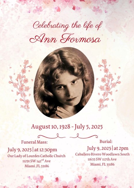 Ann A Formosa, age 96, of Cocoa Beach, Florida passed away on Saturday, July 5, 2025. Ann was born in Libya.
