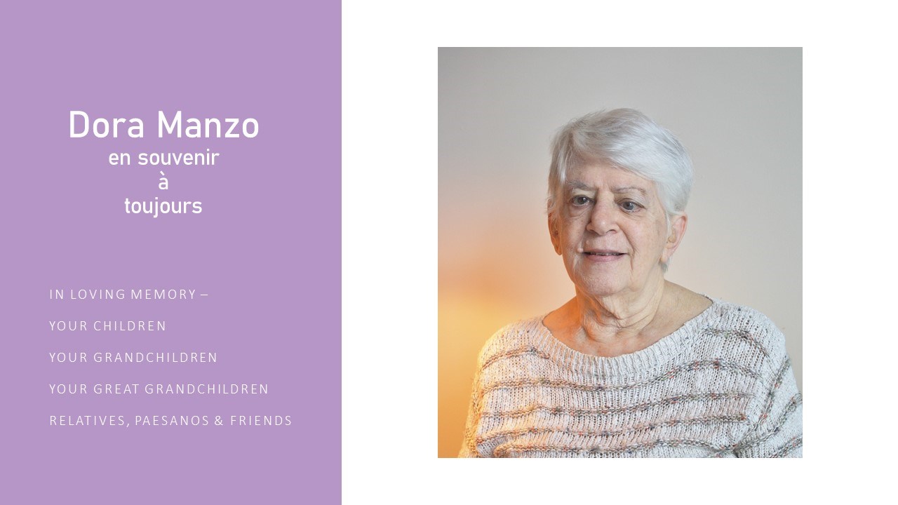 Fille de Rosina Ricciutto et Rocco Manzo, épouse du défunt mari Bernard Desjardins, Dora est née à Montréal le 5 septembre, 1930 (Petite Italie). Elle est décédée le 29 octobre, 2020 à l’Hôtel Dieu, Saint-Hyacinthe, Qc.