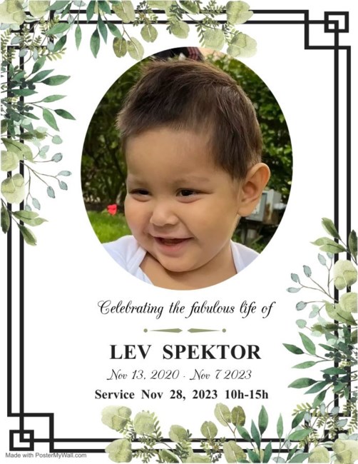 It is with heavy hearts that we come together to celebrate the beautiful life of Lev Spektor, a bright soul who touched our lives in immeasurable ways. Lev, at the tender age of three, departed on November 7, 2023, at Sick Kids Hospital in Toronto. He entered this world on November 13, 2020, at Lakeshore Hospital in Pointe-Claire, the cherished son of Qin Ping Lily Li and Alexander Spektor.