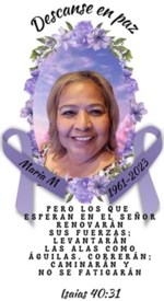 Maria Mayela Molina, age 62, passed away on Monday, November 27, 2023. A memorial service for Maria will be held Saturday, December 9, 2023 from 11:00 AM to 3:00 PM at Funeraria del Angel Greer-Wils...