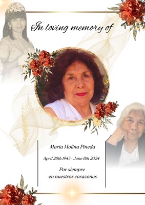 Maria M Molina Pineda, age 81, of Los Angeles, California passed away on Saturday, June 8, 2024. Maria was born in Mexico. A graveside service for Maria will be held Thursday, June 20, 2024 from 9:0...
