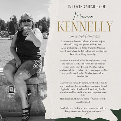 Maureen Kennelly June 26, 1964 ~ October 8, 2022 Maureen was born in Oshawa, Ontario to Joan Flintoff (Doug) and Joseph Kelly (Ann). After graduating as a dental hygienist Maureen moved west where ...