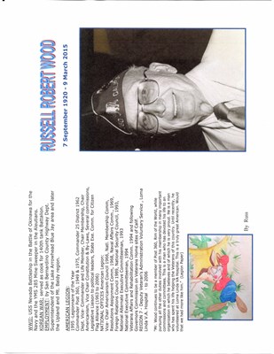 Russell Robert Wood, American Patriot, was born 7 September 1920 in Colton, California. He is the son of Roscoe Marion Wood, born Tuscola, Illinois and Myrtle Adelia Ackerman, born, Connecticut. His p...