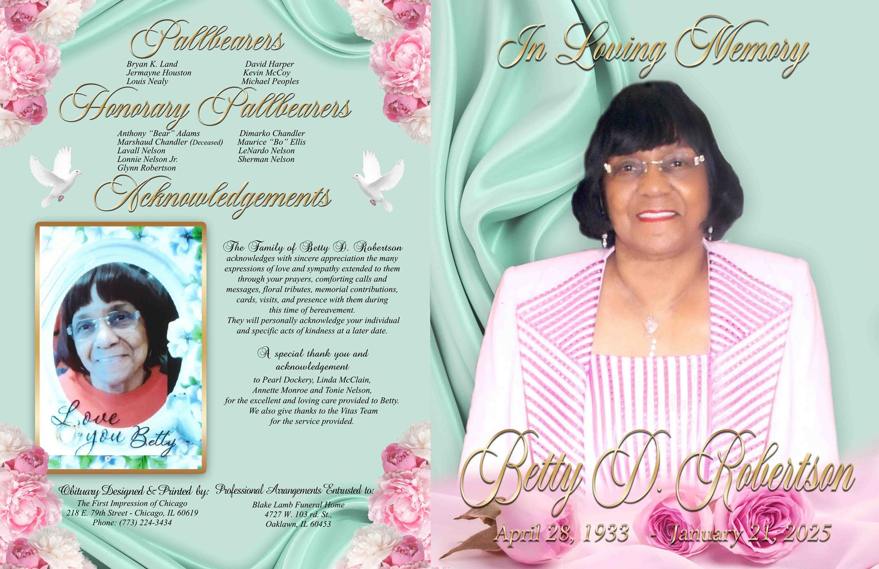 A prepast will be held at Blake-Lamb Funeral Home 4727 W. 103rd Street, Oak Lawn, on Thursday January 30th, 2025 beginning at 10:00am with a chapel funeral service to immediately follow at 12:00p.m. Interment to follow at Oak Woods Cemetery, 1035 E. 67th Street, Chicago, Illinois.