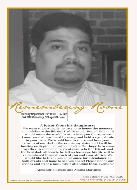 A funeral service for Manuel will be held Sunday, September 19, 2021 from 10:00 AM to 12:00 PM at Oak Hill Funeral Home & Memorial Park, 300 Curtner Ave, San Jose, CA 95125.