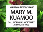 Mary Maria Kuamoo, born on May 13, 1945, passed away on October 10, 2025, at the age of 80. Any legal next-of-kin please step forward and contact Norman's Mortuary at 808-244-4065