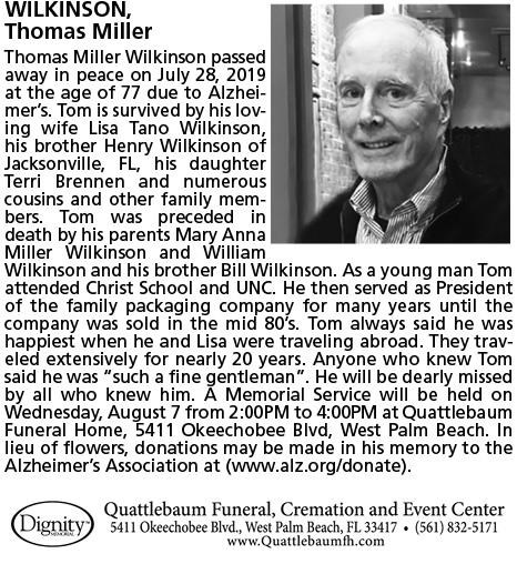 Tom was preceded in death by his parents Mary Anna Miller Wilkinson and William Wilkinson and his brother Bill Wilkinson.