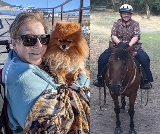 At a time when most are ready to hang up their spurs, she decided she wanted to get back in the saddle. She bought a truck, trailer, and found a horse who needed her as much as she needed him. She was able to ride the trails of Tooele County, Yellow Fork, Island Park, and Red Canyon before her health declined and her horse became a companion rather than a riding partner. Her love of animals continued to her last day. Her little dog, Doc, will miss his belly rubs and her horse, Buddy, will miss her coming out to brush him. One of Mom’s last good days was spent with family outside holding Doc and watching Buddy put on a show of running and jumping for her, expressing his joy to see her again.