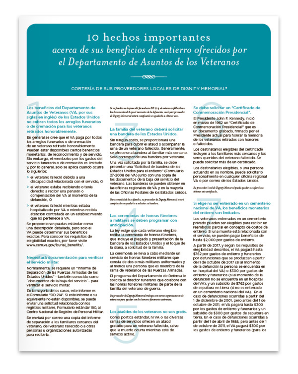 Servir en el ejército es una insignia de honor que merece reconocimiento. Nuestra guía gratuita, 10 hechos importantes sobre sus beneficios de entierro como Veterano (VA), lo guiará a través de todo lo que necesita saber para planear un funeral digno para un miembro de las Fuerzas Armadas. Desde el doblado de la bandera hasta la interpretación de “Taps” y otros beneficios del gobierno, lo ayudaremos a planificar una ceremonia conmemorativa digna de su ser querido que sirvió en nuestro país.