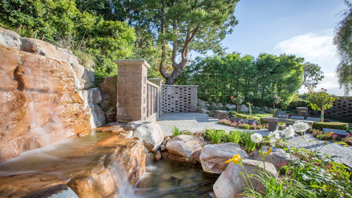 Columbarium garden at Pacific View Memorial ParkThe Reflections Cremation Garden offers peaceful and tranquil settings amidst flowing streams, waterfalls and lovely, stepped landscaping. There are many options in our gardens for those who have chosen cremation, including beautiful, freestanding memorials, statues or plaques commemorating a loved one, niches in which to place an urn, cremation boulders in which urns may be placed, pedestals, cremation benches (which may be made with or without remains) and ossuaries. Speak with one of our expert associates to learn about memorials and options in this tranquil setting.