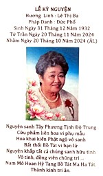 CÁO PHÓ (OBITUARY) GIA ĐÌNH CHÚNG TÔI THƯƠNG TIẾC BÁO TIN MẸ CỦA CHÚNG TÔI CỤ BÀ LÊ THỊ BA PHÁP DANH (DHARMA NAME): ĐỨC PHỔ Sinh Ngày (Born On): 12/31/1932 Mất Ngày(Passed On): 11/20/2024 at 5:43 ...