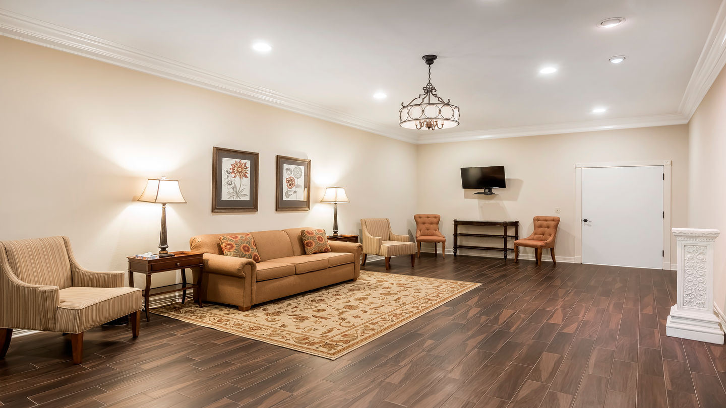 Our new chapel was built in December 2014. It’s a comfortable space with a home-like atmosphere, including credenzas and potted plants. The chapel has a warm ambiance, with soothing colors and wood tile flooring. It is well-suited for large services and seats more than 200 people. Interlocking chairs can be removed after a funeral so that the chapel can be used as a reception space. We also have large televisions for displaying pictures and video memorial slideshows.