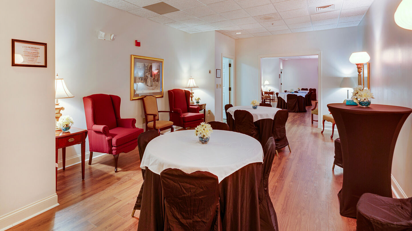 Recepción en Hickory Funeral HomeOur 13,000-square-foot funeral home has many updated features to make it attractive and convenient for families: The single-story building includes a 190-seat chapel, spacious hallways and numerous visitation rooms to accommodate your needs. As an additional service, we also provide catering and have a dedicated space for families to enjoy their meal.
