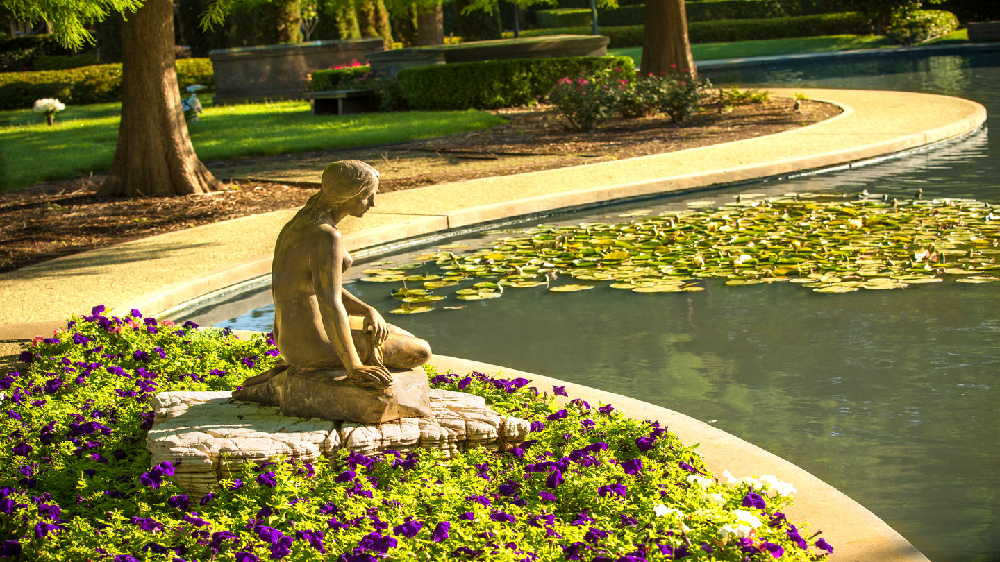 Tranquil setting along Lakeside Garden at Sparkman/Hillcrest Funeral HomeAcres of green rolling berms encircle the grounds painted with the palettes of the seasons. Like a silken Persian carpet, summer is radiant with the splendid crepe myrtle reds, pinks and lavenders, and the beds of annual blues, purples, yellows and corals. Fall flourishes with an explosion of scarlet, mahogany and russet against a background of brown and taupe. Winter possesses its own subtle palette of live oak sage, gray and taupe. Spring reinvigorates the landscape with early redbuds followed by blossoming Bradford pears and dogwoods. On the south end of the property, the “Little Mermaid” lake shimmers like a cabochon sapphire reflecting this march of the seasons.
