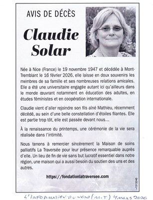 Claudie Solar est née à Nice (France) le 19 novembre 1947 et est décédée à Mont-Tremblant le 16 février 2026, à l’âge de 78 ans. Elle résidait à Arundel (Québec). Elle laisse en doux souvenirs les mem...