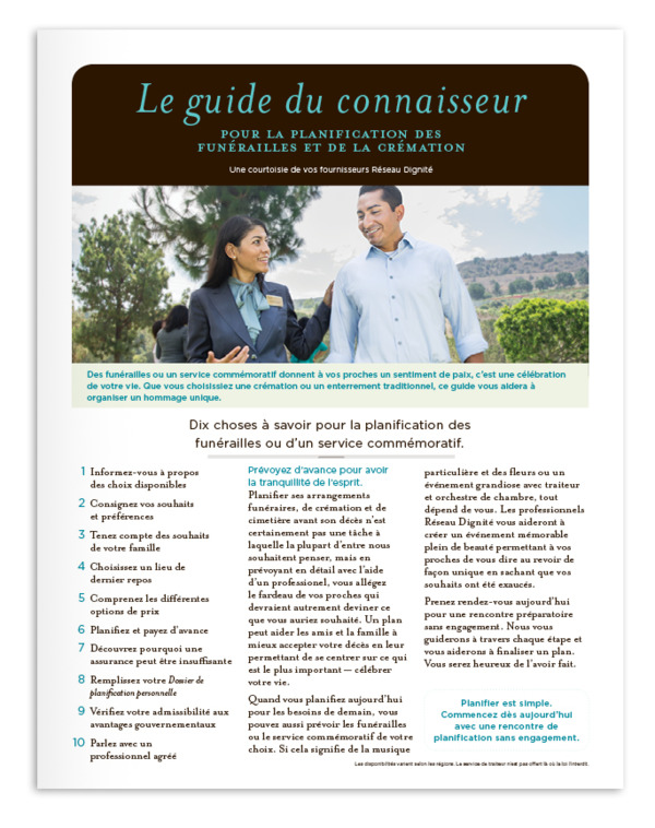 Chaque vie est unique. Vos passions particulières et les moments importants de votre vie racontent une histoire unique. Le guide du connaisseur pour la planification des funérailles et de la crémation vous présente des idées inspirantes et les étapes simples de la planification d'une cérémonie commémorative inoubliable en hommage à la vie de la personne aimée—ou la vôtre lorsque vous planifiez pour le futur. Commencez dès aujourd'hui.