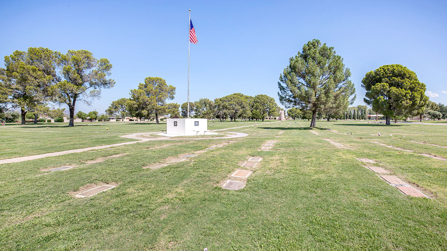 Cremation garden at Funeraria del Angel South Lawn & South Lawn CemeteryComprising 85 acres, our cemetery is an expansive oasis in the desert. On two sides, the Santa Catalina Mountains rise majestically in the distance. We are a welcoming place, and South Lawn Cemetery can accommodate most any burial preference: