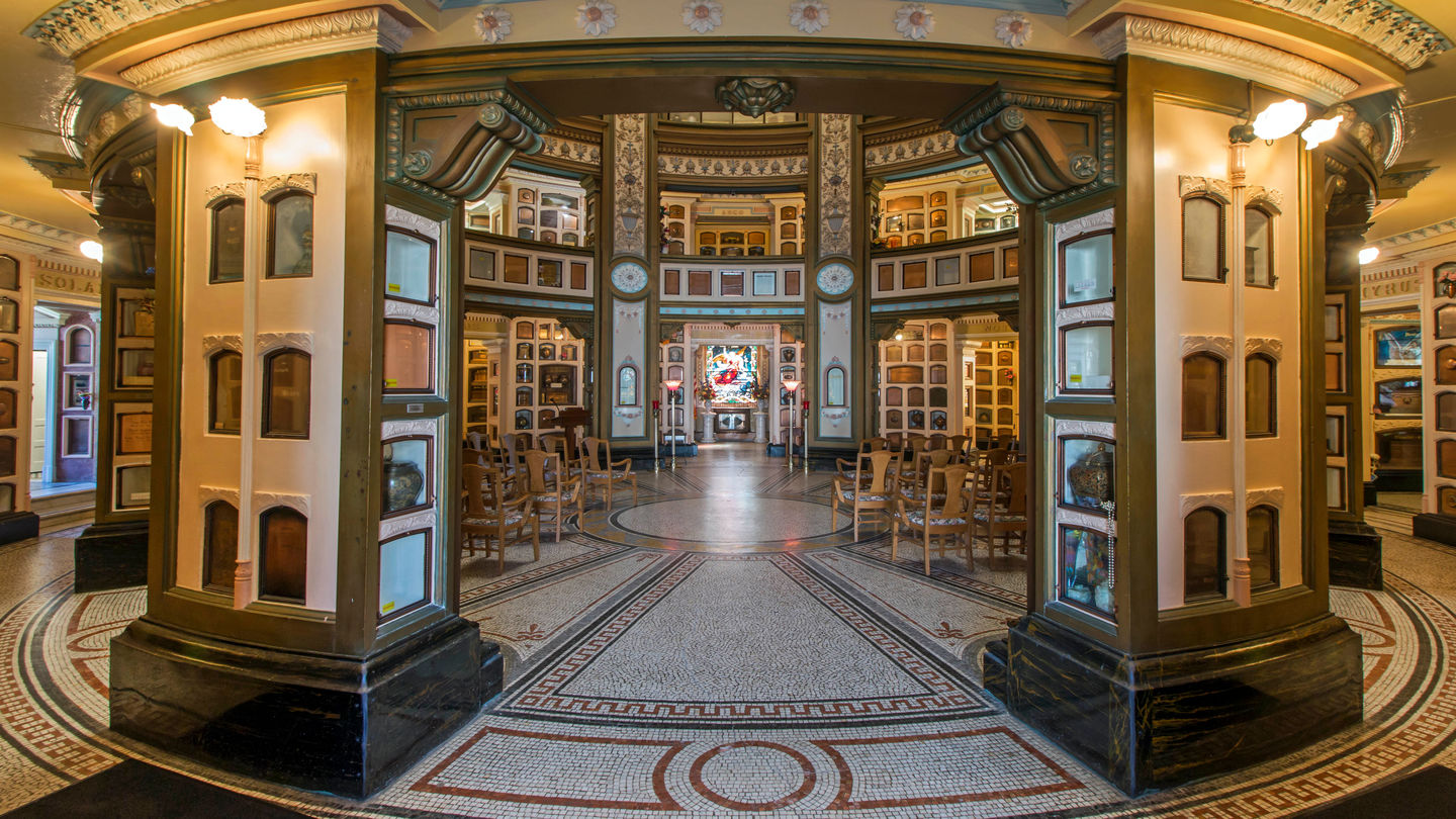 Three main halls—Hall of Olympians, Hall of Titans and Hall of Heroes—house around 8,500 niches containing cremated remains and memorabilia special to those buried here. Six of the ground-floor rooms have stained-glass windows, one of which has been attributed to both Louis Comfort Tiffany and John La Farge.