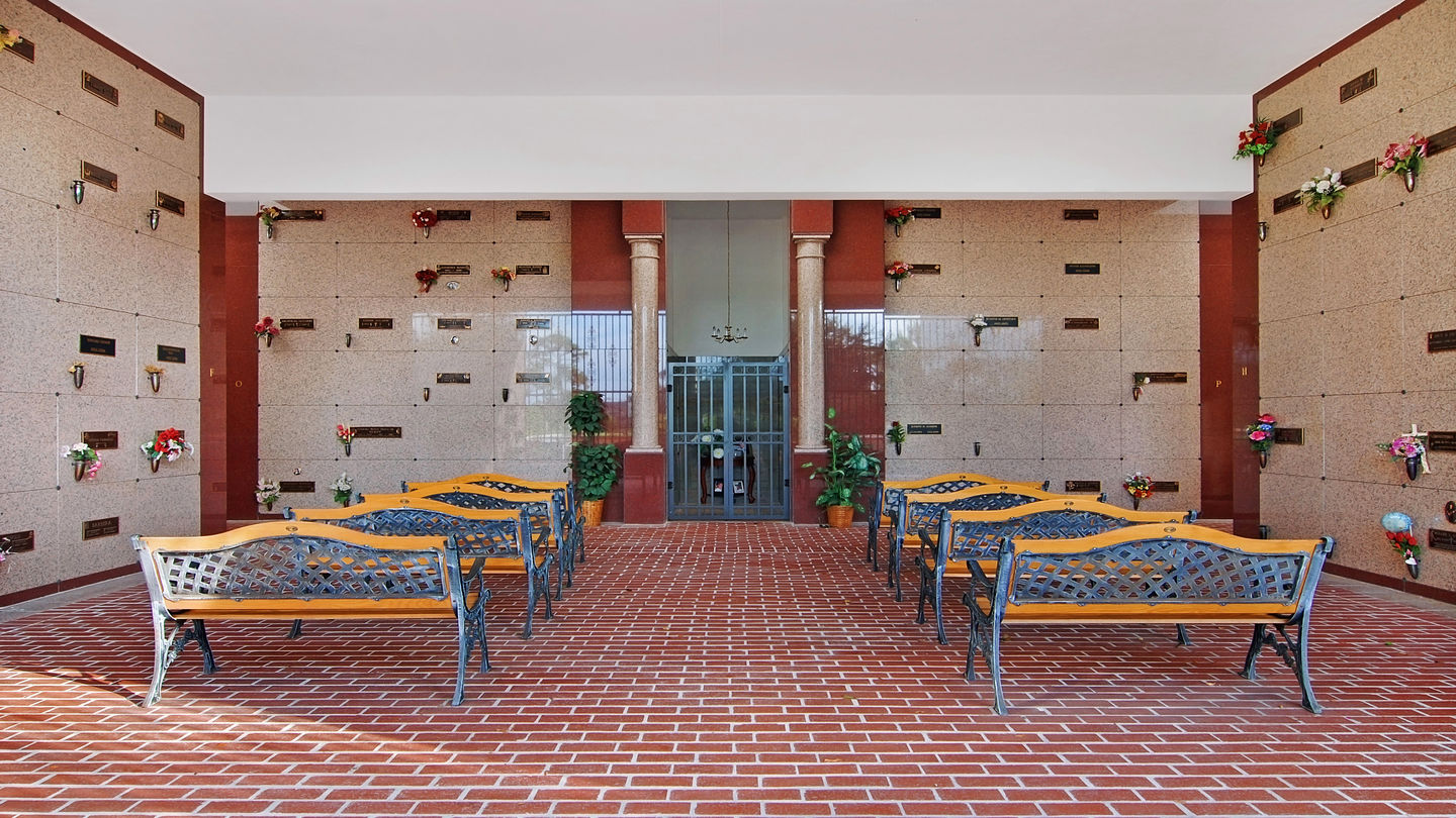 Mausoleum at Riverside Memorial ParkAs you walk the lush cemetery grounds shaded by large oak trees, pine trees and palms, you will find a wide choice of burial options. The memorial park accommodates in-ground burials in many landscaped gardens that permit a range of monument options, both upright and flat. The most recent garden—Hope—includes hedge estates. Four outdoor mausoleums accommodate both casket burials and cremations. Faith mausoleum opened in 2019; it includes an indoor area with glass-front niches for thoughtful displays. It complements the previously existing mausoleums: Heritage Hall, Liberty Hall and Victory Hall. The latter is designed with an open-air courtyard with bench seating for visitors who want to take time for reflection.