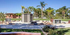The cremation garden has a tiered water fountain and a trellis covered in ivy. Jets create gentle babbling sounds, and crystal clear water flows down a stream bed lined with rock. This garden also has cremation benches, niches and posts.