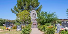 Special feature of an angel statue at Resthaven Park Cemetery. A walkway lined by palms leads to a private mausoleum in the Garden of Eternal Rest. The exclusive Desert Dove Estates offers a modern rocky landscape with options for in-ground burial as well as cremation benches. In a garden called Our Lady of Guadalupe, rose bushes flank the walkway to the center, where a statue of the lady sits. The Lady of La Vang is a Vietnamese garden and exclusive to members of Glendale's Vietnamese Martyrs Parish.