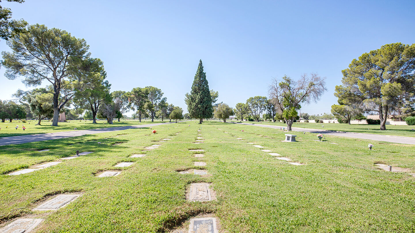 Cremation garden at Funeraria del Angel South Lawn & South Lawn CemeteryComprising 85 acres, our cemetery is an expansive oasis in the desert. On two sides, the Santa Catalina Mountains rise majestically in the distance. We are a welcoming place, and South Lawn Cemetery can accommodate most any burial preference: