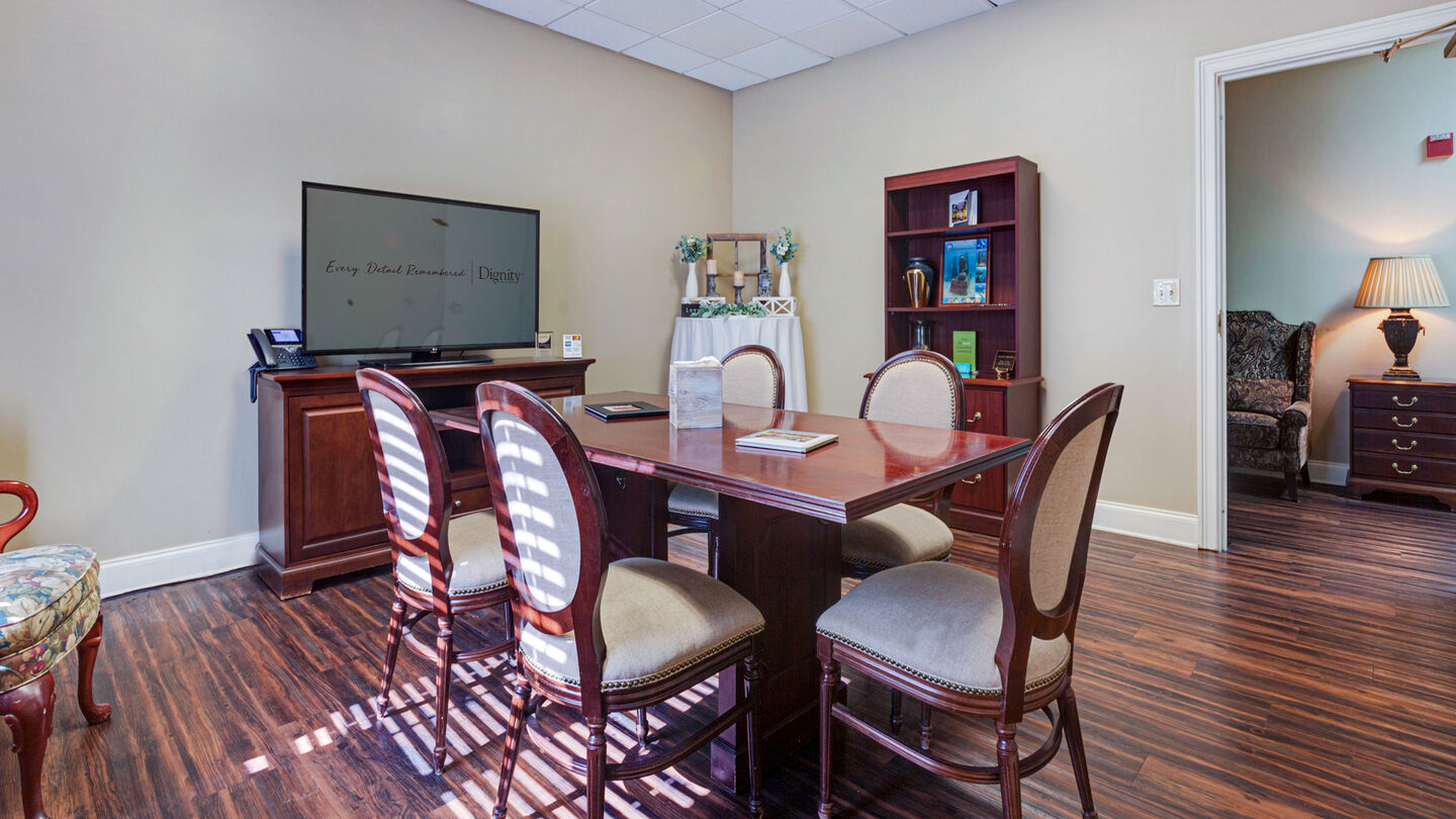 Arrangement room at Hardage - Giddens Chapel Hills Funeral Home and CemeteryWe are proud to be a member of the Dignity Memorial® network of funeral, cremation and cemetery service providers. When you choose Hardage-Giddens Chapel Hills Funeral Home and Chapel Hills Memorial Gardens, you get not only the warm, friendly service you expect from a Jacksonville funeral home, but also the value you deserve. Please call Hardage-Giddens Chapel Hills Funeral Home for immediate assistance planning a funeral or if you would like more information about our services.