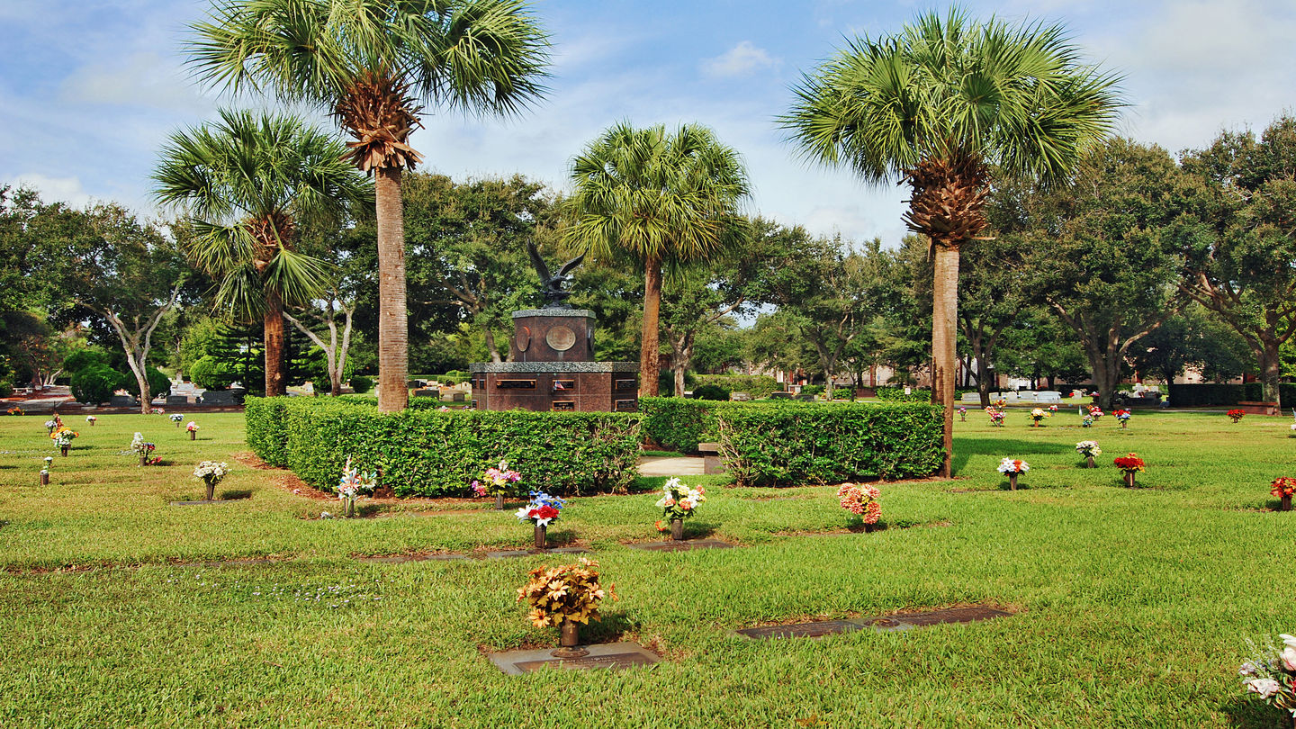 Mausoleum at Riverside Memorial ParkAs you walk the lush cemetery grounds shaded by large oak trees, pine trees and palms, you will find a wide choice of burial options. The memorial park accommodates in-ground burials in many landscaped gardens that permit a range of monument options, both upright and flat. The most recent garden—Hope—includes hedge estates. Four outdoor mausoleums accommodate both casket burials and cremations. Faith mausoleum opened in 2019; it includes an indoor area with glass-front niches for thoughtful displays. It complements the previously existing mausoleums: Heritage Hall, Liberty Hall and Victory Hall. The latter is designed with an open-air courtyard with bench seating for visitors who want to take time for reflection.