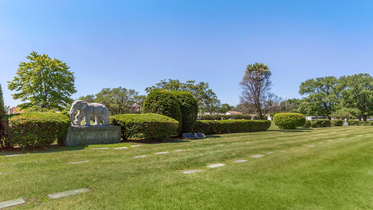 Landscaping at Woodlawn Memorial ParkOne of the more famous areas of the cemetery property is Showmen’s Rest, a 750-plot section reserved mostly for circus performers. In 1918, the Showman’s League of America designated a portion of Woodlawn Memorial Park as the final resting place for approximately 60 members of the Hagenbeck-Wallace Circus, who were killed in a train wreck. Five statues of elephants with lowered trunks surround the area (although no elephants are buried at the cemetery). To this day, many circus performers still choose to be buried at Showman’s Rest at Woodlawn.