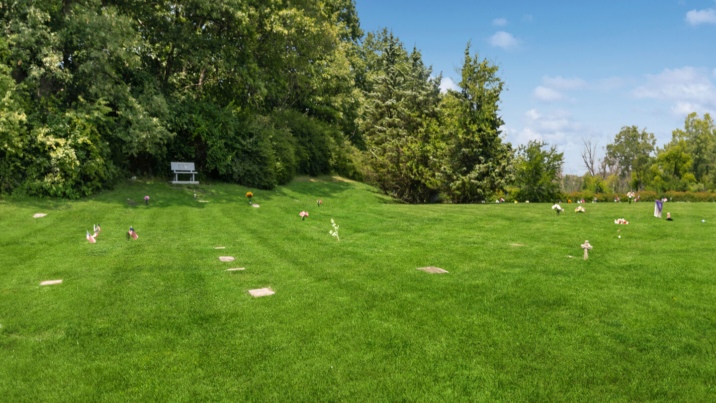 The cremation garden has cremation benches and above-ground inurnments, monuments for urns with companion posts and an area for scattering cremated remains.