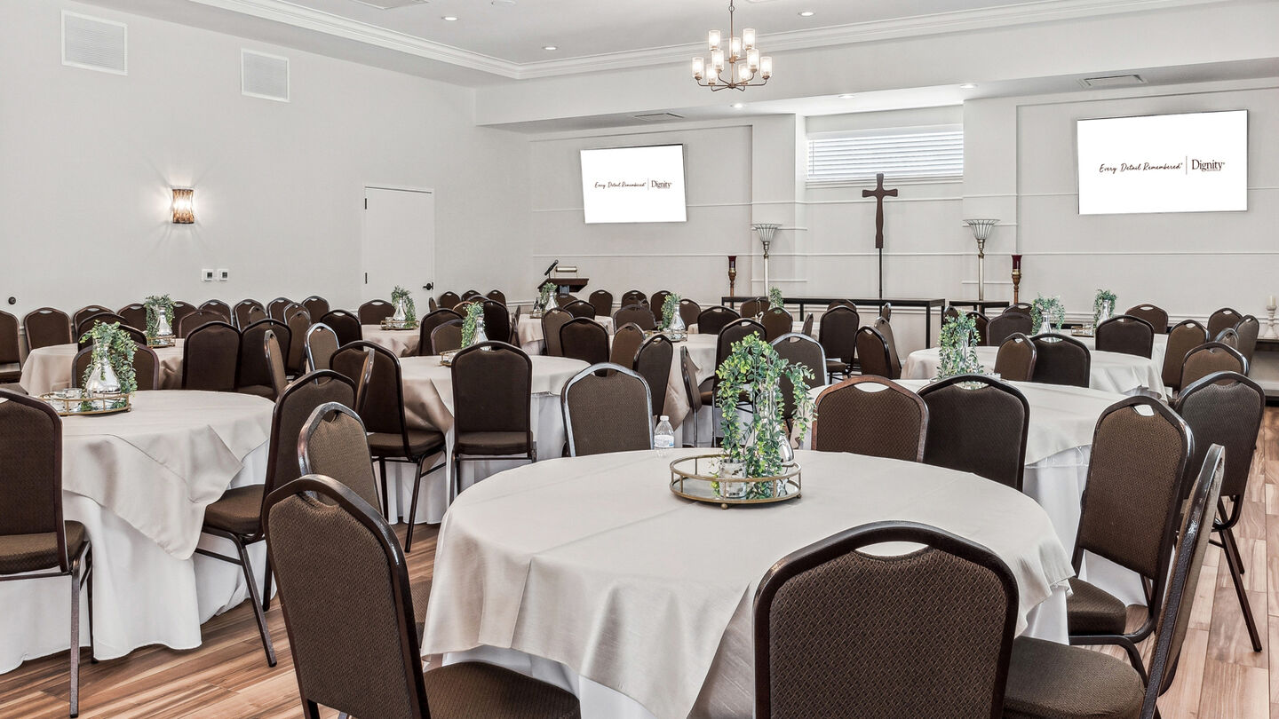 Our beautifully remodeled funeral home was designed with modern families in mind. The light-filled chapel with pews is a serene setting for traditional services, while our celebration of life room—with its round tables and flexible layout—invites guests to share stories and a meal. For smaller, more intimate gatherings, the coffee lounge is a comfortable place to connect over refreshments. Full catering services allow you to focus on being with family and friends.