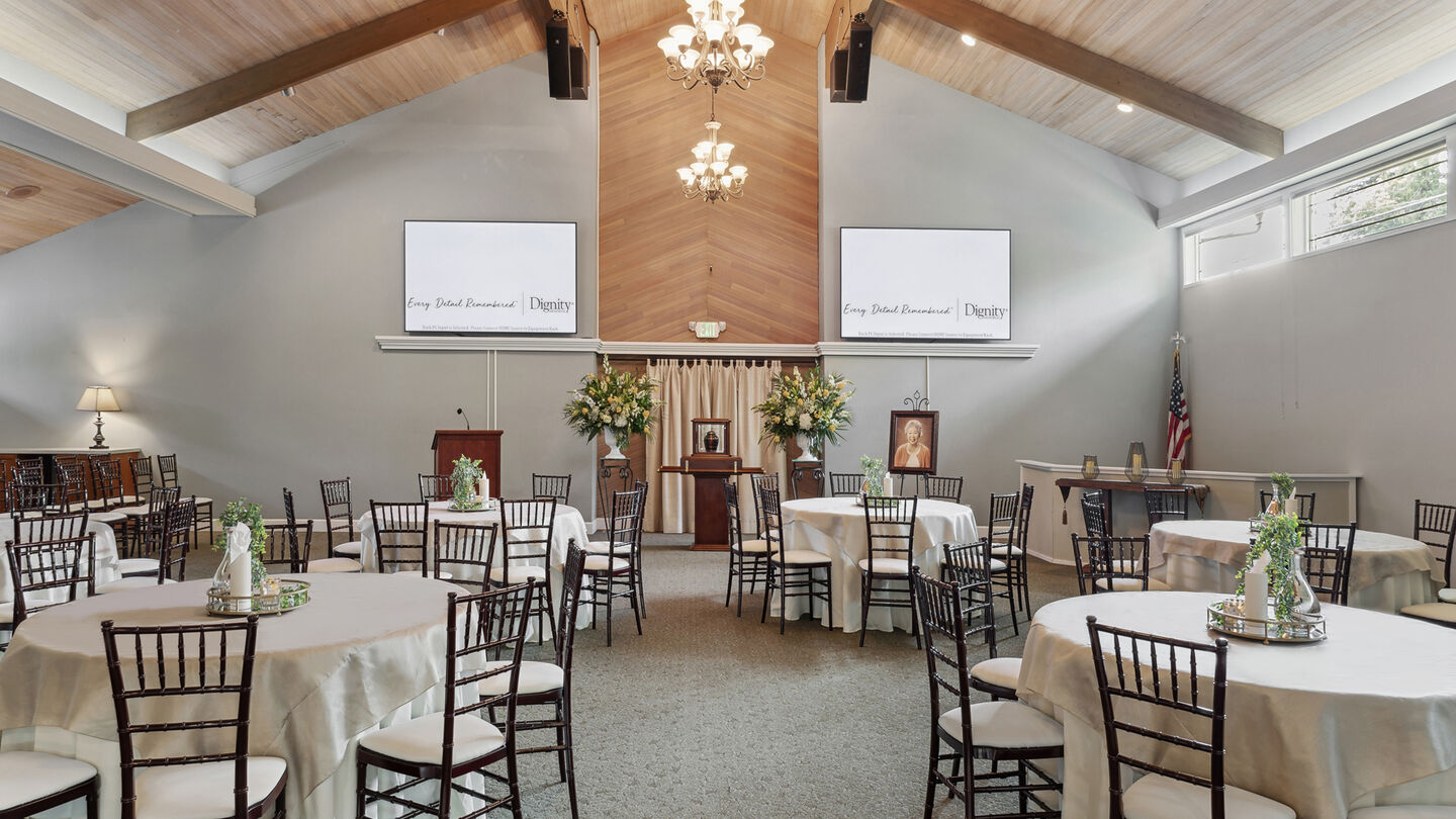 The funeral home's Celebration Hall includes a non-denominational chapel that seats 120 guests. The hall has an up-to-date audiovisual system, including a pair of 90-inch televisions. The reception area has a full kitchen, high-top tables and chairs, and televisions. Services requiring additional seating may make use Celebration Hall's atrium.