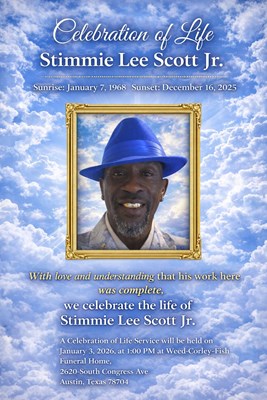 Stimmie Scott Jr. passed away on December 16, 2025, at the age of 57. A visitation will be held at Weed-Corley-Fish South Chapel, located at 2620 South Congress Avenue, Austin, Texas, 78704. The vis...