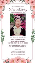 Bee Xiong, born on September 15, 1924, passed away on September 22, 2025, at the age of 101. A visitation will be held on October 26, 2025, from 8:00 am until October 27th at 10:00 am at Kaul Funera...