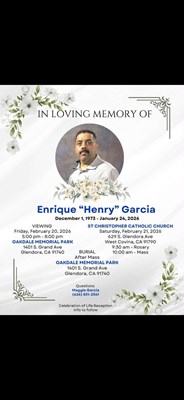 Enrique (Henry) Garcia, age 52, passed away at home on Saturday, January 24, 2026, with his family by his side. Enrique was born on December 1, 1973, in Los Angeles, California. He is survived by his ...